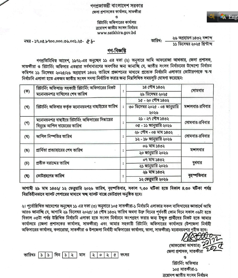 | ৩ | রিটার্নিং অফিসারের কার্যালয় হতে নির্বাচনের সময়সূচি সংক্রান্ত গণ-বিজ্ঞপ্তি। | | ১২-১২-২০২৫ | দেখুন |